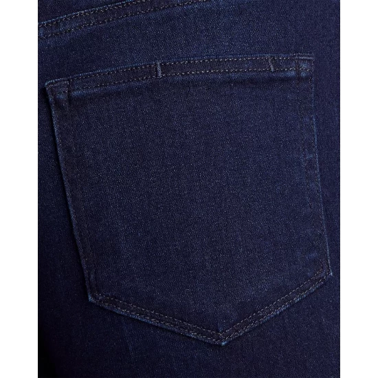 - Zip fly with button closure, five-pocket silhouette
