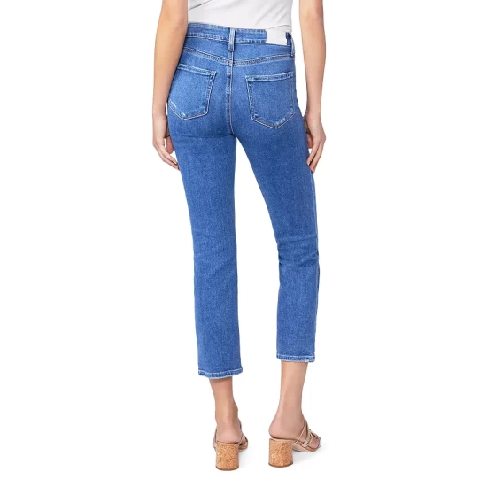 - Zip fly with button closure, five-pocket silhouette